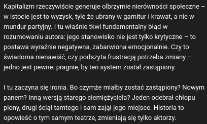 Także mamy tu ciekawy przykład człowieka, który bardzo dobrze zdaje sobie sprawę, że system jest wielce niesprawiedliwy. Ale nie należy z tym nic robić, ponieważ jesteśmy do tego biologicznie uwarunkowani. Tak więc Pan faszysta wierzy, że jego biologcznym przeznaczeniem jest służyć bogaczom i korporacjom, zwalczać jakąkolwiek lewicową ideologię i oczekiwać na biologiczną rewolucję ludzkiego mózgu. Ewentualnie Pan faszysta mógłby jeszcze podbić władzę i samemu stanąć na szczycie, ale nie zrobi tego, gdyż faszyzm jest jedynie przedłużeniem władzy tej samej burżuazji, której buty liże Pan autor.