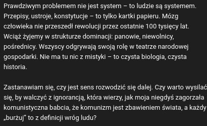 2. Autor sugeruje, że przepisy, ustroje i konstytucje nie stanowią systemu, a jedynie kartki papieru. System nie może więc zostać zmieniony za pomocą legislatury, a jedynie za pomocą... biologii? Autor sugeruje iż mózg człowieka nie przeszedł rewolucji przez ostatnie 100 tysięcy lat. To sugeruje o bardzo ograniczonej wyobraźni autora – gdyż nie potrafi on sobie wyobrażić wprowadzenia bardziej sprawiedliwego sytemu – ale również i o ograniczonej wiedzy. Autor nie słyszał o liberaliźmie, ani epoce oświecenia.