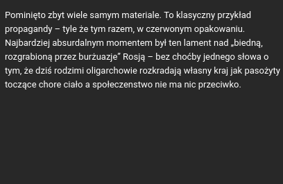 4. Autor zarzuca mi, że lamentuję nad Rosją rozgrabioną przez burżuazję, nie wspominając słowa o oligarchach. Mój bracie w Jezusie Chrystusie – oligarchowie są burżuazją! Autor sugeruje, że oligarchia rozgrabia Rosję niczym pasożyt (myślałem, że to jest ok, bo jesteśmy do tego biologicznie uwarunkowani), oraz, że społeczeństwo nie ma nic przeciwko temu (tym samym Pan faszysta dokonuje projekcji swojej psychologii na całe rosyjskie społeczeńśtwo - Panie faszysto, to, że Pan nie usiłuje walczyć z niesprawiedliwością i pasywnie liże but systemu, nie znaczy, że całe rosyjskie społeczeństwo tak robi).